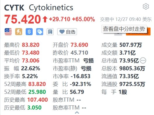 Cytokinetics(CYTK.US)暴涨65%,报75.42好意思元。音书上,该公司于当地时期12月27日通知,SEQUOIA-HCM考试获取积极后果,这是针对其药物Aficamten在症状性膺惩性肥厚性心肌病(HCM)患者中的要道3期临床考试。SEQUOIA-HCM后果裸露,与抚慰剂比拟,Aficamten调理显赫改善了通顺才略。